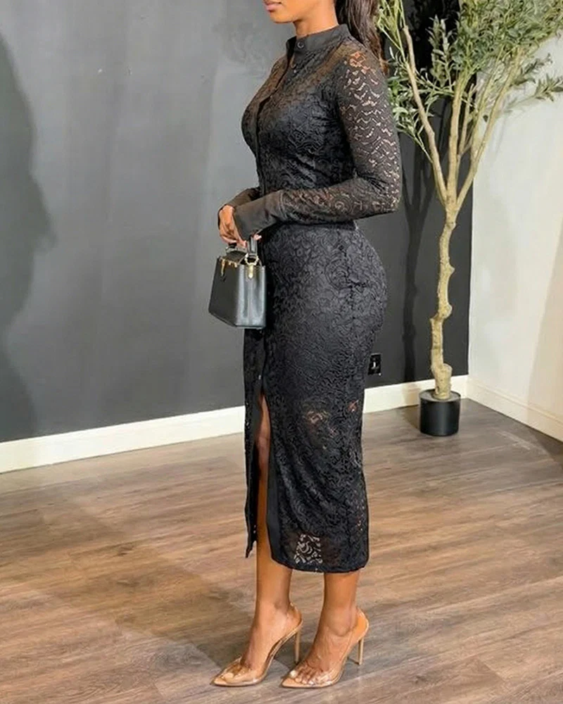 DESIGN – Stand Collar & Button Details: Designed with a sophisticated stand collar to frame the neckline and a full-length button-down front that allows for adjustable styling. The sheer long sleeves create a graceful contrast with the lace texture, while the lower slit below the buttons increases mobility and adds a dynamic visual element.