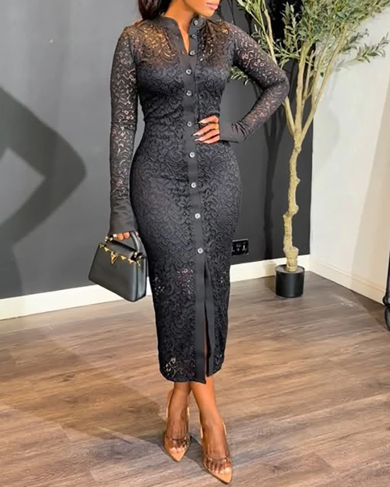 CHICME Women’s Stand Collar Floral Lace Mid-length Dress Long Sleeve Button Down Bodycon Dress with Cami Lining Set