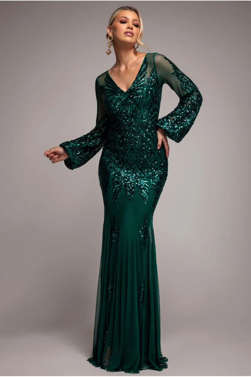 Embellished Sequin Bishop Sleeve Maxi Dress – Emerald Green by Goddiva