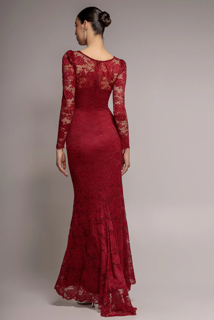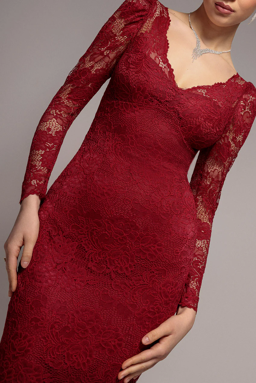 Step into refined glamour with the Goddiva Fit & Flare Scallop Lace V Neck Maxi Dress in Burgundy. Featuring a plunging V neckline with scalloped edges, long sleeves, and a flattering fit and flare silhouette, the dress flows elegantly into a dramatic mermaid hem for a sultry, feminine finish. Perfect for nights out, cocktail parties, or special celebrations, it balances sophistication with a touch of alluring charm. The rich burgundy hue exudes luxury and depth, making it ideal for weddings, evening events, or elegant dinners. Pair with statement heels and delicate jewellery for a captivating look that feels high-end yet effortlessly attainable.