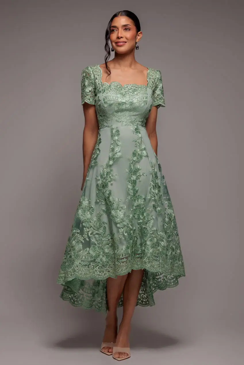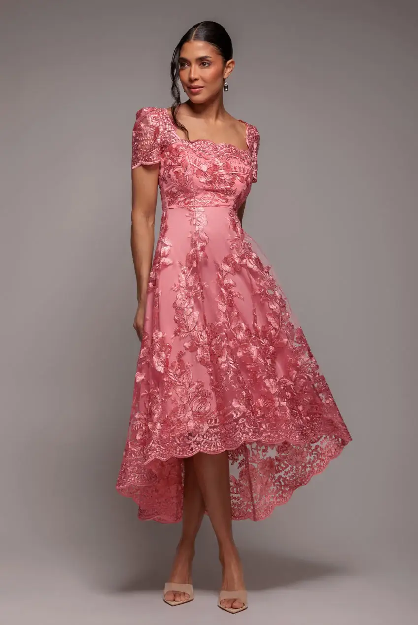 Modern romance with a couture inspired edge defines the Goddiva Scalloped Neck Embroidered Lace High Low Midi Dress in Burgundy, a luxe statement piece designed for unforgettable moments. Rich Burgundy tones contour the silhouette beautifully, delivering that coveted high end aesthetic at an irresistible price point. A square neckline framed with a delicate scalloped edge enhances the dcolletage, while short sheer embroidered lace sleeves add an alluring, feminine finish. The fitted bodice flows into an elegant A line skirt, creating a flattering hourglass illusion. A high low scalloped hemline showcases just the right amount of leg, bringing a sultry edge to this chic Burgundy midi dress. Perfect for weddings, race day, garden parties, date nights and glamorous evenings out, this Burgundy embroidered lace dress is a standout choice for special occasions. Wear it once, style it again for another event, and keep the compliments coming. This new season must have delivers timeless glamour with a modern, fashion forward twist.