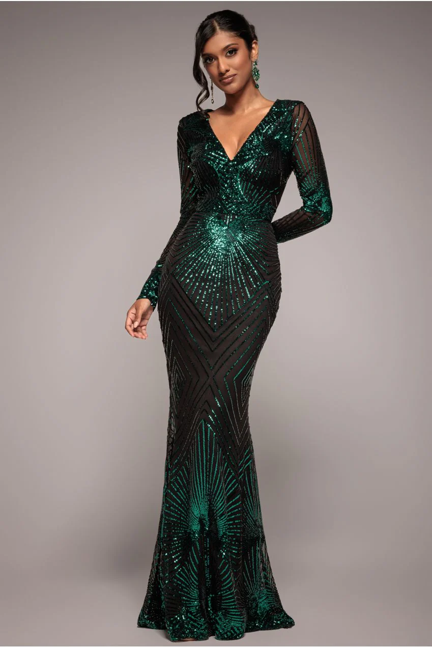 Turn up the heat in this starburst effect maxi dress by Goddiva. This impressive sparkling evening dress brings a unique twist to a classic little number. Its all over sequins splashed in a starburst effect, gives this long occasion dress an artistic vibe. Its flirtatious plunge v neck, classic long sheer sleeves and its exquisite fishtail hem give it that extra touch of elegance. This timeless emerald maxi dress is the winning choice for any occasion. At its affordable price, this dark Emerald occasion gown is sensational, especially with its red-carpet-inspired style. Shopping for an occasion dress has never been easier, so, why not look flawless in this obvious choice for wedding guests, bridesmaids, prom queens and any other special occasion. Be ready for all events when you have this dress in your life.