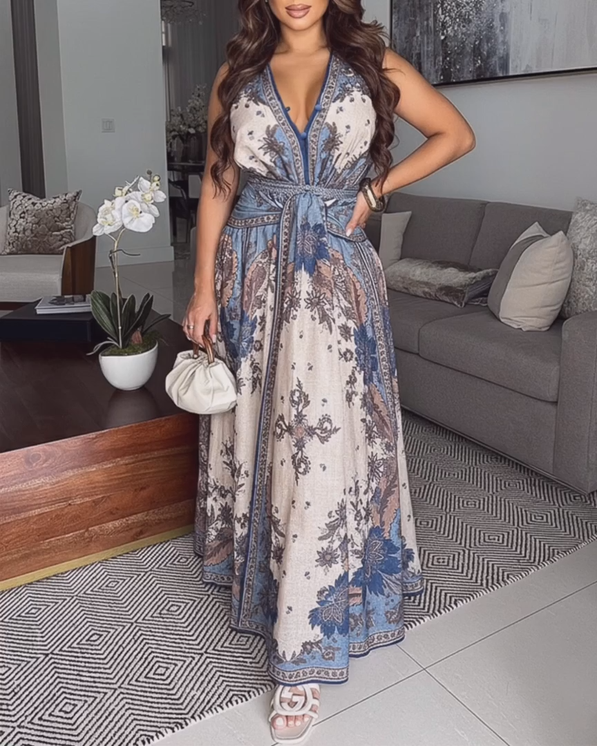 Women’s Vintage Floral V-Neck Maxi Dress Sexy Backless Lace-Up Slit Dress Casual Shirred Draped Vacation Dress