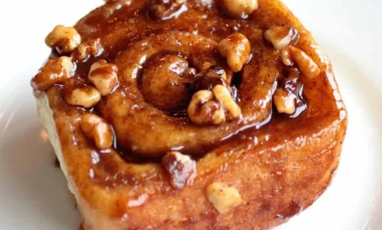 While dough is rising, melt 3/4 cup butter in a small saucepan over medium heat. Stir in 3/4 cup brown sugar and whisk until smooth. Pour into greased 9×13″ baking dish. Sprinkle 1/2 cup walnuts over top and set aside.